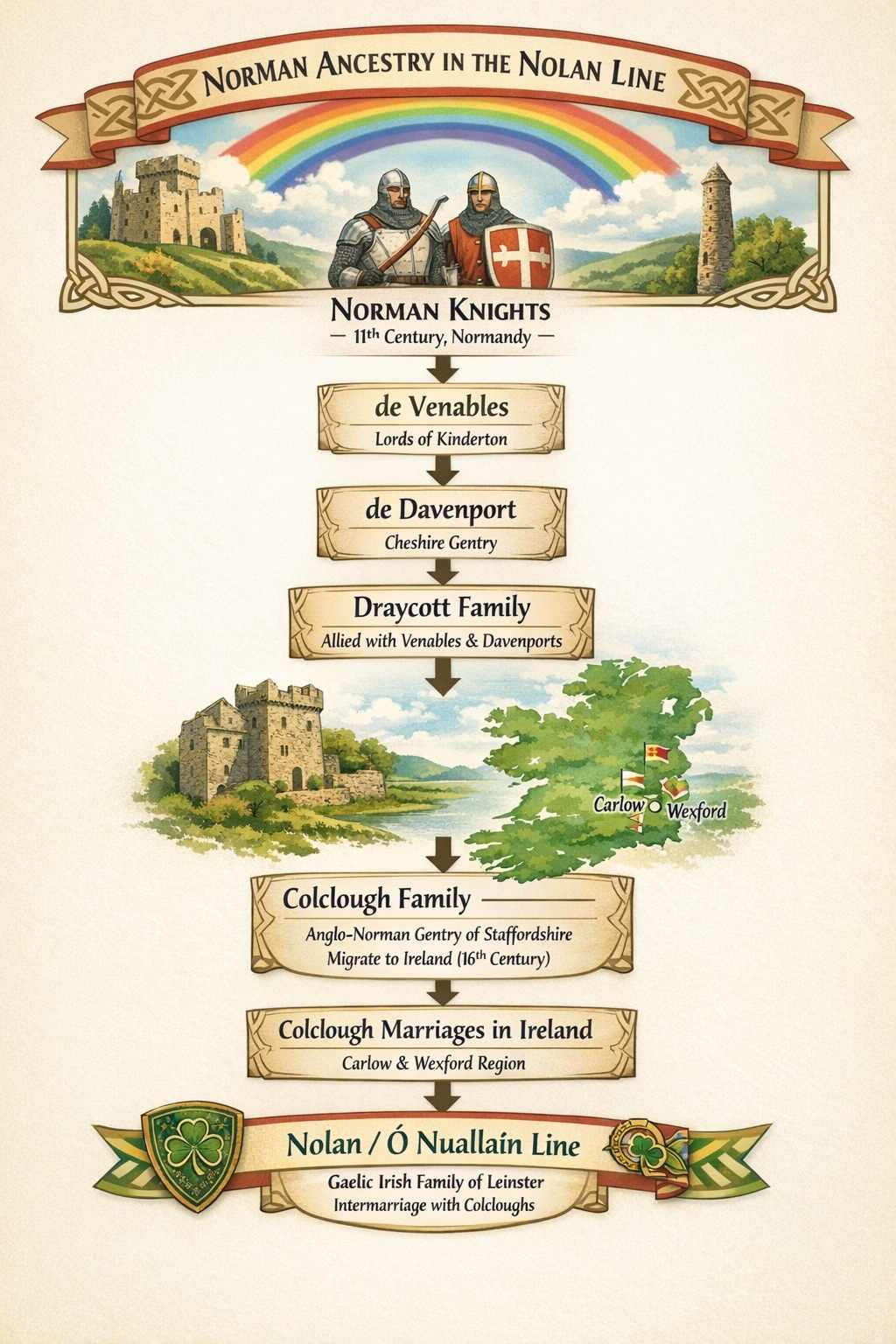 Norman Knights (11th–12th c.)→Venables / Davenport / Draycott→Colclough (Norman-English gentry)→Ireland (16th c.)→Marriage into Nolan families